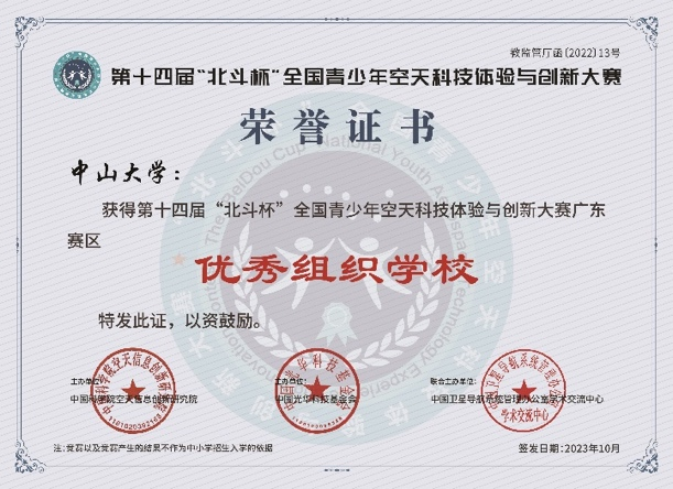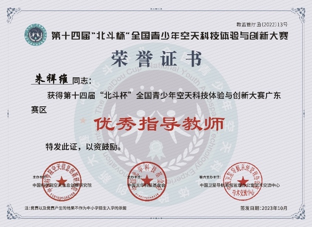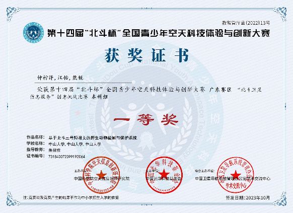 在10月28日举办的第十四届“北斗杯”全国青少年空天科技体验与创新大赛上,ok138cn太阳集团2021级本科生钟柠泽、汪怡、熊锐在朱祥维教授的指导下完成的作品“基于北斗三号短报文的野生动物检测与保护系统”,在获得第十四届“北斗杯”全省一等奖后,又获得了全国一等奖。太阳集团tyc9728荣获广东省赛区优秀组织单位,朱祥维教授荣获优秀指导老师荣誉。