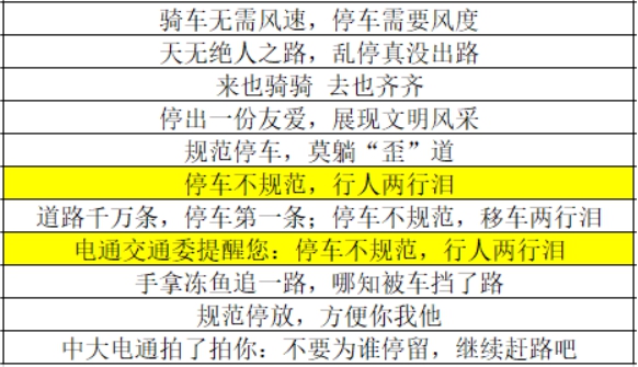 面对单车、自行车无序停放的棘手问题,学院调整停车空间划分,多次开展单车摆放志愿活动,然而,这和师生们主动有序规范停车、真正实现“停车自由”尚有差距。针对于此,学院向同学们发起了“标语创作征集”活动,呼吁大家共同营造文明有序的校园环境。最终经过“标语投票”优中选优,选出以下11句标语制作标牌,摆放在学院大楼前的道路两旁。