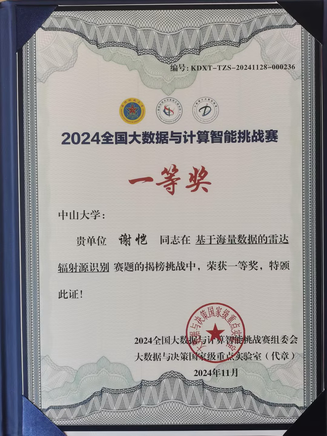 近日,2024全国大数据与计算智能挑战赛决赛圆满落幕。我院谢恺副教授担任队长及指导老师,带领博士研究生林进健和硕士研究生孙慧博组成的参赛团队,在基于海量数据的雷达辐射源识别赛题中表现出色,凭借卓越的技术实力和团队协作,一路过关斩将,最终荣获该科目全国第一名的优异成绩。