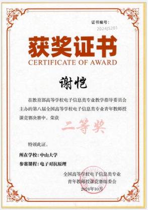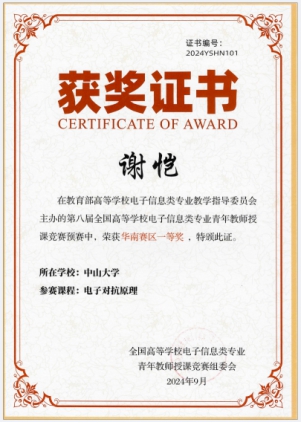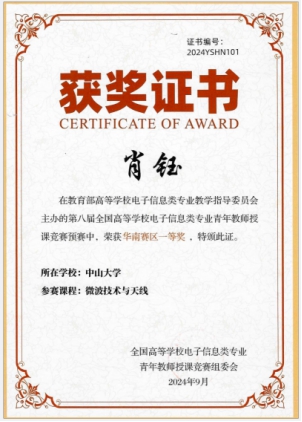 10月18日至20日,由教育部高等学校电子信息类专业教学指导委员会主办、中国计量大学承办的第八届全国高等学校电子信息类专业青年教师授课竞赛决赛在杭州成功举办。我院肖钰副教授和谢恺副教授分别荣获决赛一、二等奖。