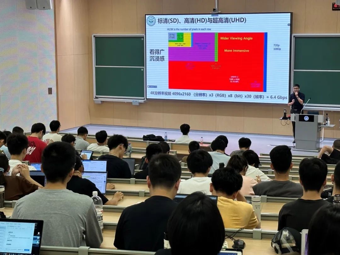 张云教授作《面向新一代视频系统的智能编码方法研究》学术报告,从视频与现代生活的密切联系切入,主要介绍新一代8K超高清、三维视频和AR/VR/MR视频系统、内容表示特性,国际视频编码技术与标准,以及基于人工智能的高效视频编码。他指出,随着摄像、显示和数字计算技术的进步,视频技术一方面朝着超8K高清视频方向发展,分辨率、帧率、动态范围扩展以更逼真地展示世界;另一方面往三维化、多自由度交互式方向发展,虚拟现实(VR)、增强现实(AR)和混合现实(MR)提供沉浸式宽视场,多自由度和虚-实结合全新交互式视觉体验。通过深入浅出的讲解和实际案例,他带领同学们走进了视频技术的世界,展望了视频技术在国家城市安全、教育医疗、文化影视、自动驾驶等领域的广泛应用前景。