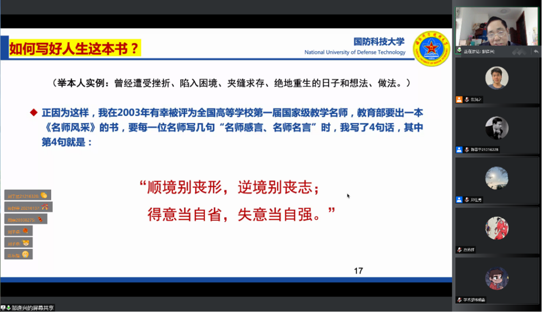5月4日下午,ok138cn太阳集团电子信息大讲堂第六期暨“五四”青年节特别篇在线上举行。本期电子信息大讲堂主题为《如何写好人生这本书?》,由首届国家级教学名师、军队新时期教书育人先进楷模、国防科技大学退休教授邹逢兴主讲,学院党委副书记郑仕勇主持。