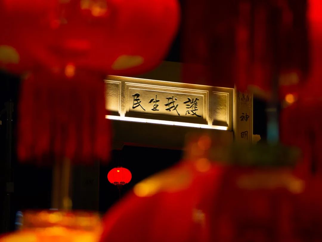 作品说明:透过散发浓浓年味的灯笼之间仰视古庙石牌坊,护我生民四个字显示出神明年年岁岁守护一方的魄力。