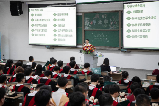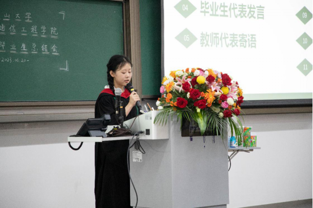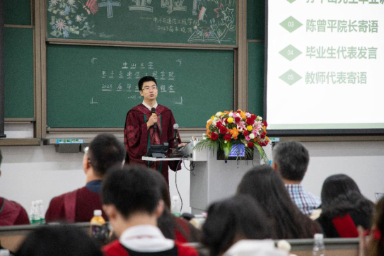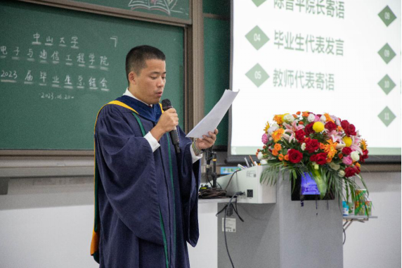 时光如陀螺飞转,岁月如白驹过隙,多年的努力和奋斗,多年的风风雨雨,在此刻即将落幕,这是大学阶段的最后一次欢聚,是向母校告别的日子,同学们都有说不完的话,有回忆不完的故事。学生代表姚少辉、成沛枫、羿洪彬、刘浩回忆着在中大的往事,从刚入学的新生军训、社团招新、各种篮球赛事,再到灯火通明的电通期末夜、再到对所有兢兢业业,尽职尽责的老师的感谢,就是这些点点滴滴的小事,组成了大学内所有的回忆,也会成为未来永不忘的念想。短暂的大学时光不知不觉间已经走到了尽头,未来还有很长的路要走,在这经历的一切将会成为未来面对困难的坚硬垫脚石。