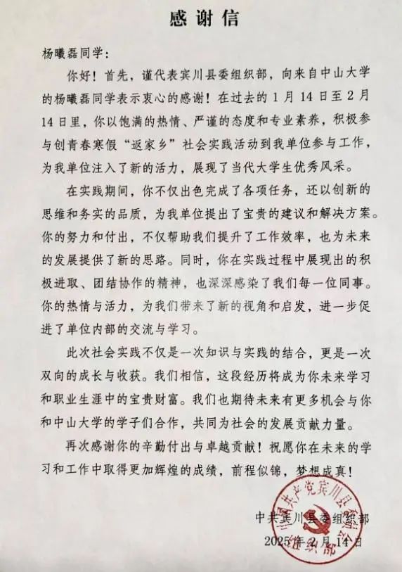 2023级本科生杨曦磊在云南省宾川县委组织部实习期间,协助整理党员档案、会务材料,系统学习基层党组织工作规范与流程。