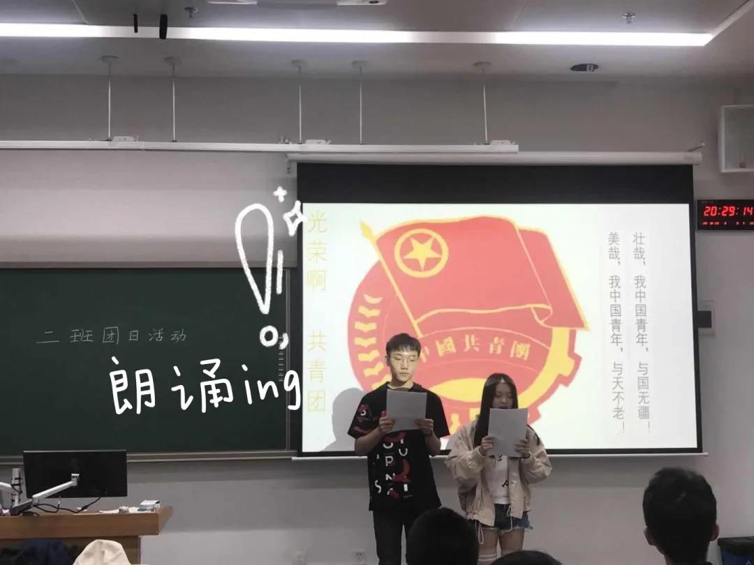 一.全体同学肃立,奏唱国歌,团歌;二.组织委员与体育委员为大家带来朗诵—《奔涌吧,后浪》(改编);三.全体同学一起学习了全国学联二十七大精神;四.分组并进行知识竞赛;五.观看相关短片;六.趣味互动游戏;七.团支书作活动总结;八.奏唱校歌;九.宣布活动结束,复原教室。
