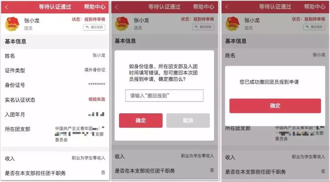 若发现身份证实名认证状态为“校验中”,请耐心等待,系统会于72小时内二次校验完毕。“校验中”的团员,不能被支部审核“通过”,也不能“退回”。但如果资料错误需要重新提交,可以由团员本人自行撤回,重新编辑提交。
