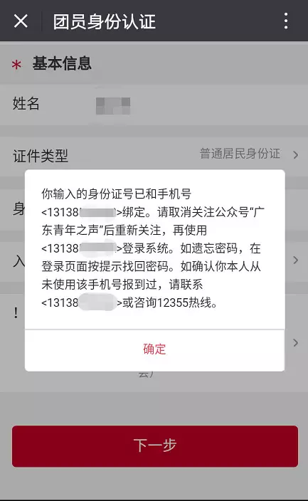 2. 如果非你本人的手机号码,可能是身份证号泄漏,被他人使用,可能被所在村/社区组织代为报到。可以按页面提示,拨打电话联系对方,确认情况。如确实被盗用且无法联系对方,可联系组织反馈,或致电12355热线,提供具体信息,工作人员帮助查询系统中你的“所在团支部”,进一步联系系统中的所在组织核实具体情况,并可以验证身份进行手机号换绑,以及后续的组织关系转接。