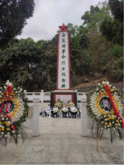 为了缅怀先烈,弘扬烈士们的革命英雄主义精神,启迪后人,1992年12月白花洞村的人民群众倡议捐资,在村落主要出入口修建了“白花洞革命烈士纪念碑”。纪念碑顶部是一个立体的五角星,碑体四周有汉白玉栏杆,基座碑文记载着革命烈士的英名和事迹。2019年,光明区在原白花洞革命烈士纪念碑的基础上对其进行修缮,完善功能性、增强文化性、提升景观性,充分发挥其“褒扬烈士,教育群众”的主题功能。公园整体设计提炼白花洞红色历史文化脉络,运用到景观、构筑物等展示互动场景中,建设纪念碑广场、烈士浮雕墙、烈士雕塑等,打造集瞻仰纪念、追思缅怀、文化传承、爱国主义教育、休闲活动为一体的现代化红色教育基地。