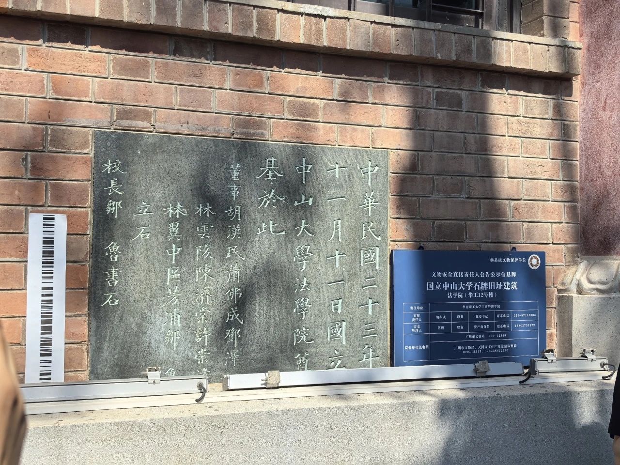 华南理工大学12号楼现为华南理工大学工商管理学院大楼,原系国立太阳集团tyc9728法学院楼,其台阶东侧墙壁上嵌一石碑,上刻:中华民国二十三年十一月十一日国立太阳集团tyc9728法学院奠基于此,董事胡汉民、肖佛成、邓泽如、陈济棠、许崇清、林翼中、区芳蒲、邹鲁立石,校长邹鲁书石。岁月翩跹,任法学院南侧广场日晷盘上光影流转,石碑九十载餐风饮露,其上字迹依然清晰醒目。