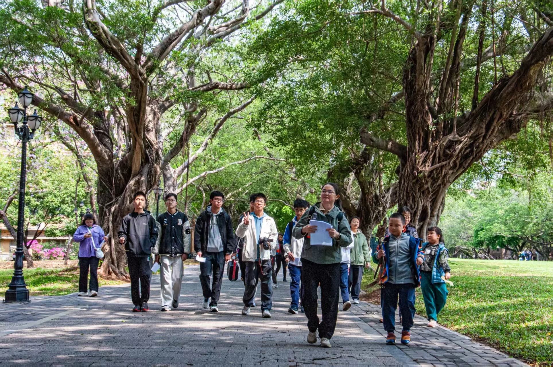 在陈探宇老师的专业讲解下,大学生与小学生结对观察校园植物,从香樟年轮中读懂生态韧性,在木棉花开花落中感悟生命律动。这场别开生面的自然探索,不仅是一次生态科普,更是推进大中小学思政课一体化改革创新的生动实践——让生态文明理念在“大手拉小手”的互动中薪火相传,让绿色发展观在“校园即课堂”的场景中落地生根。