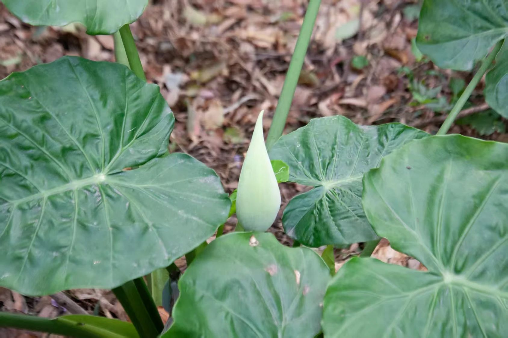 滴水观音,天南星科海芋属,又名海芋,是常见的观赏植物。其叶片大而翠绿,形似心形,花序为肉穗花序,佛焰苞白色或淡绿色。