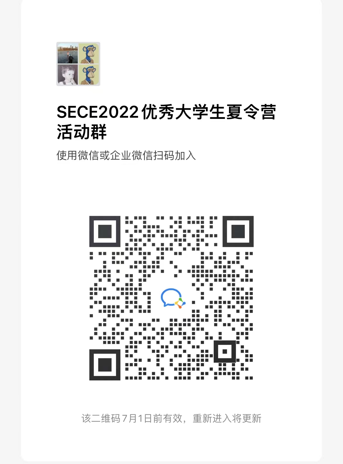 我院2022年优秀大学生夏令营将于6月26日(周日)举办,以腾讯会议线上形式开展。以便我院做好后续安排,请名单人员扫码加入企微活动群。
